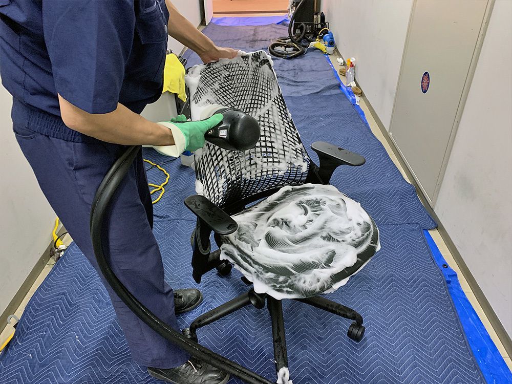 カーペット同様に、チェアやソファも専用マシンがないとなかなかクリーニングできません。様々な種類の汚れやシミを、専用のマシンと専用の薬剤で落としていきます。